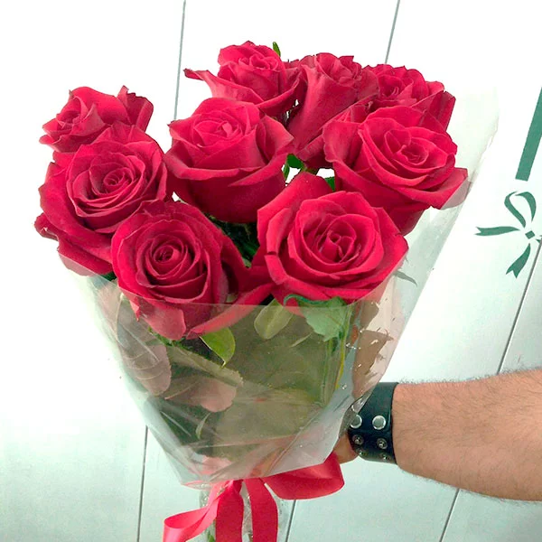 Роза красная 70 см - 9 шт, упаковка, лента. На фото представлен букет из 9 роз.