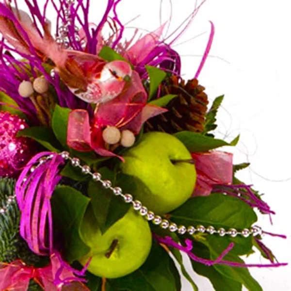 Стандарт: Живые еловые ветки, рускус, декоративные яблоки - 2 шт., лесные шишки - 3 шт., новогодние игрушки - 3 шт., тинги, декоративная птичка - 1 шт., сухоцветы и новогодний декор.