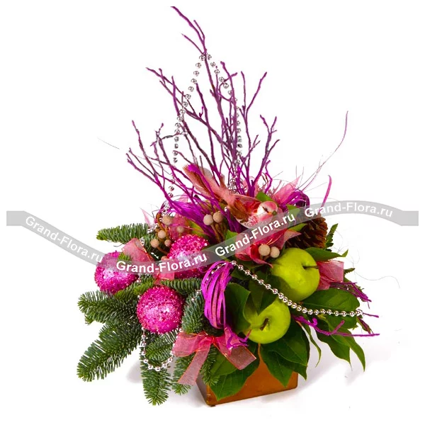 Уменьшенный: Живые еловые ветки, рускус, декоративные яблоки - 1 шт., лесные шишки - 1 шт., новогодние игрушки  - 1 шт., тинги, декоративная птичка - 1 шт., сухоцветы и новогодний декор.