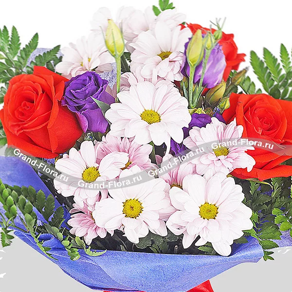 Стандартный (на фото): роза красная - 3 шт., хризантема кустовая  светло фиолетовая - 2 шт., эустома фиолетовая - 2 шт., папоротник - 5 шт., фетр синий, бант красный.