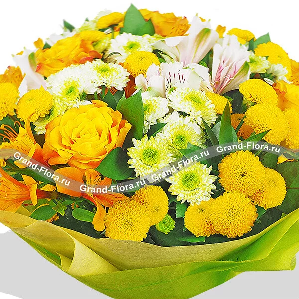 ДЕЛЮКС: роза желтая/оранжевая - 11 шт, хризантема кустовая желтая - 7 шт, альстромерия желтая - 5 шт, альстромерия белая - 4 шт, хризантема кустовая белая - 7 шт, рускус, фетр зеленый.