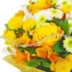 ЛЮКС: роза желтая/оранжевая - 7 шт, хризантема кустовая желтая - 5 шт, альстромерия желтая - 3 шт, альстромерия белая - 2 шт, хризантема кустовая белая - 5 шт, рускус, фетр зеленый.