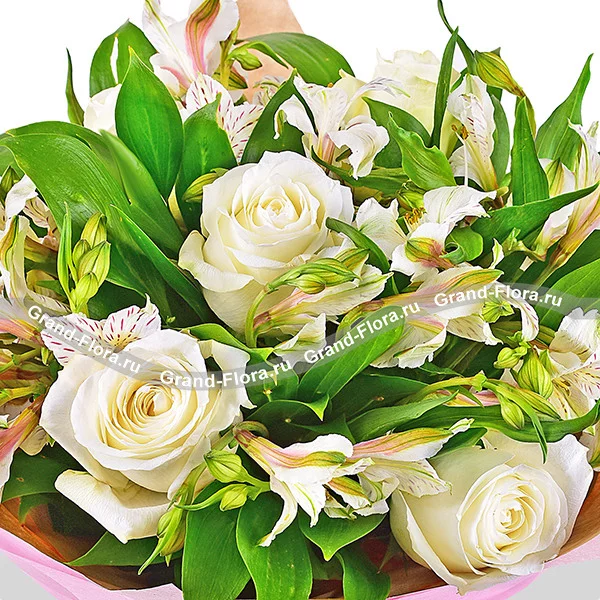 Жемчужное ожерелье - букет из белых альстромерий и роз