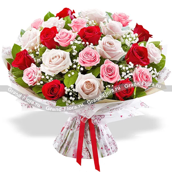 Изящное сочетание элегантных белых, розовых и красных роз деликатно дополнено гипсофилом и салалом.