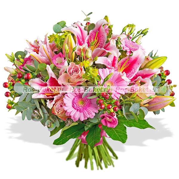 лилия розовая - 2 шт., роза розовая - 5 шт., гербера розовая - 4 шт., эустома розовая - 3 шт., гиперикум красный - 3 шт., эвкалипт - 3 шт., рускус - 3 шт., бант розовый.