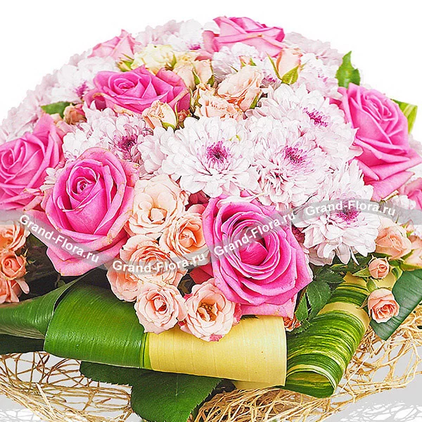 Роза розовая - 15 шт., роза кустовая розовая - 10 шт., хризантема кустовая светло-фиолетовая - 10 шт., лист аспидистры загнутый - 8 шт., упаковка натуральная.