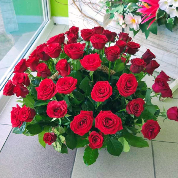 Выбрали 51 розу. Заказали доставку по случаю юбилея нашего руководителя и очень рады что выбрали именно эту компанию! Все соответствует фото на сайте: светлая корзина и отменные, крупные красные розы.
