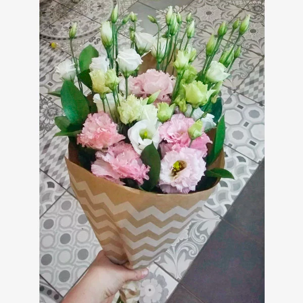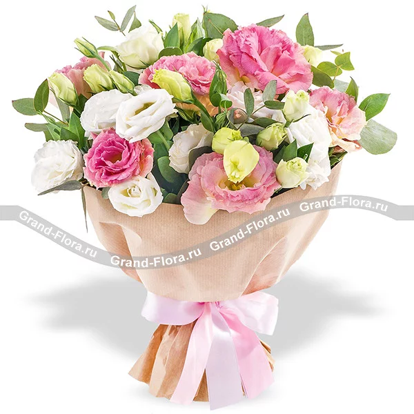 Стандартный: эустома розовая - 7 шт., эустома белая - 4 шт., декоративная зелень, упаковка крафт, лента розовая.