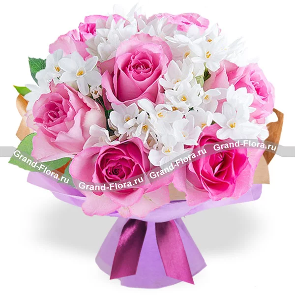 Стандартный: роза розовая - 3 шт., нарциссы белые - 20 шт., упаковка, лента.