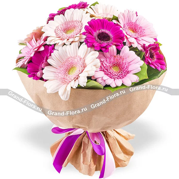 Стандартный: гербера малиновая - 6 шт., гербера розовая - 5 шт., декоративная зелень, упаковка крафт, лента.