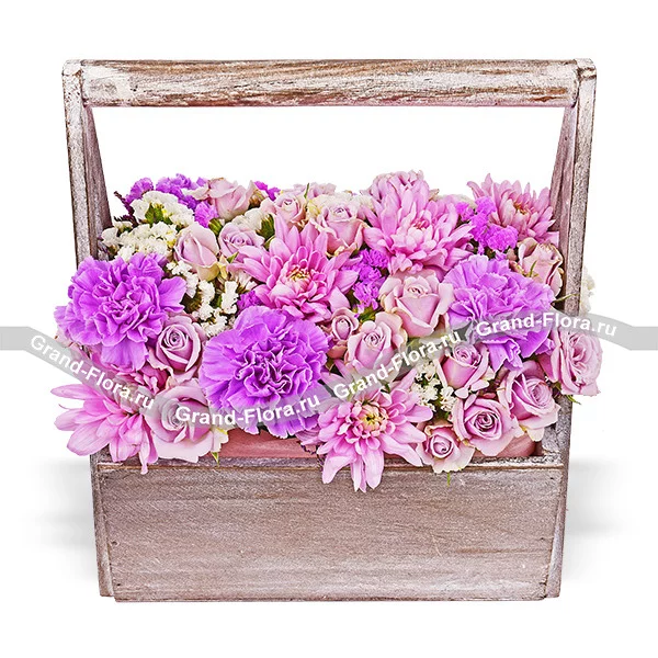 Уменьшенный: гвоздика фиолетовая - 5 шт., роза кустовая фиолетовая - 3 шт., хризантема кустовая ромашковая - 3 шт., статица, оазис, ящик.