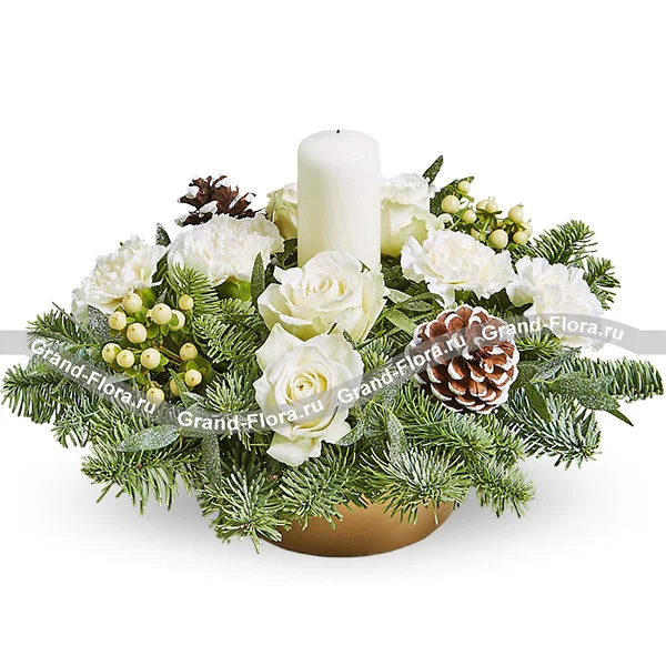 Стандартный: роза белая - 5 шт., гвоздика белая - 4 шт., гиперикум - 2 шт., шишка - 2 шт., декоративная зелень, свеча, ель, оазис, коробка.