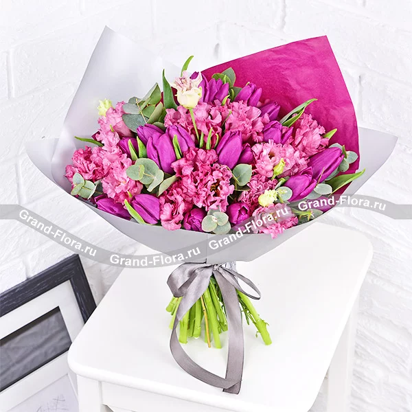 Стандартный: тюльпан фиолетовый - 15 шт., эустома розовая - 10 шт., упаковка, лента.