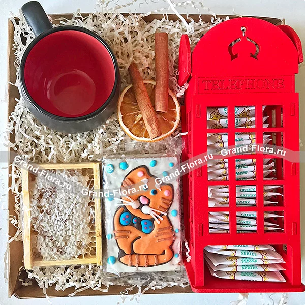 Стандартный: подставка под чайные пакетики в виде телефонной будки в английском стиле - 1 шт., чашка - 1 шт., чай в пакетиках - 1 упаковка, Покровский пряник - 1 шт., мед/медовые соты - 1 шт., подарочная коробка - 1 шт., наполнитель, декор (палочки корицы, сухофрукты).