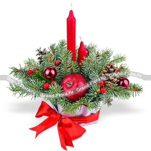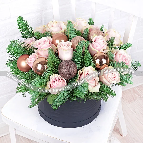 Стандартный: роза розовая - 7 шт., ель, шарики - 5 шт., оазис, коробка.
